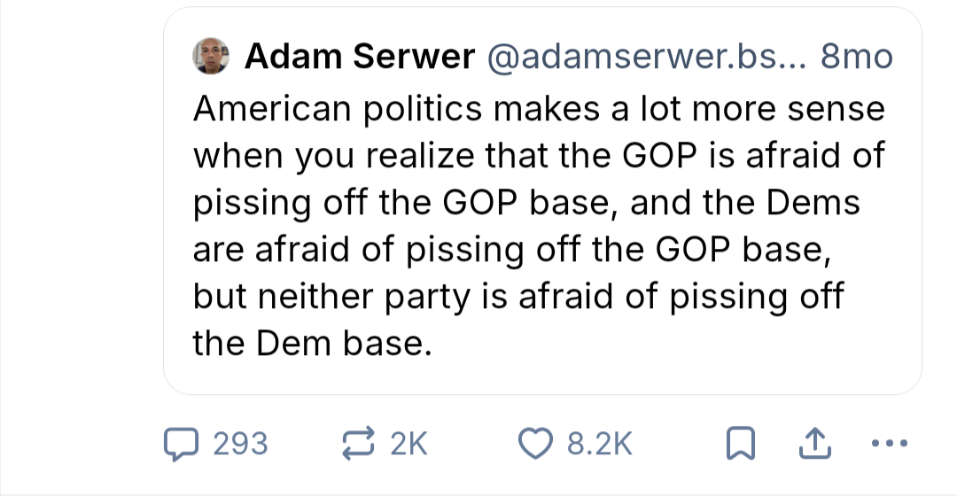 I think it’s comes down to the fact that there are far fewer wealthy Dems than Republicans. The Dem “base” doesn’t have any power or influence outside of our voices, which is to say, none.