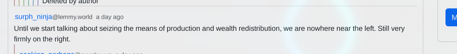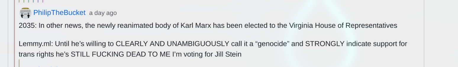 And, seeing the post reminded me of why I am banned and can’t respond on .ml with my feelings about it. That reason is: Someone some days ago posted a genuinely hopeful article about how these somewhat-leftist candidates are actually winning in America now, which really doesn’t happen all that often, and then this transpired: