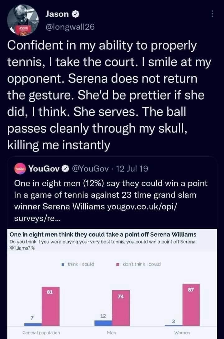 Confident in my ability to properly tennis, I take the court. I smile at my opponent. Serena does not return the gesture. She’d be prettier if she did, I think. She serves. The ball passes cleanly through my skull, killing me instantly