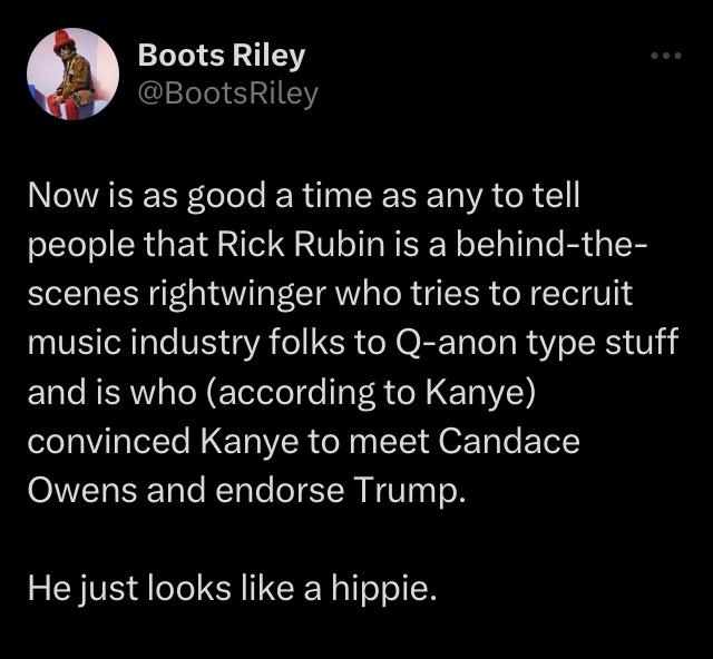 Now is as good a time as any to tell people that Rick Rubin is a behind-the-scenes rightwinger who tries to recruit music industry folks to Q-anon type stuff and is who (according to Kanye) convinced Kanye to meet Candace Owens and endorse Trump.