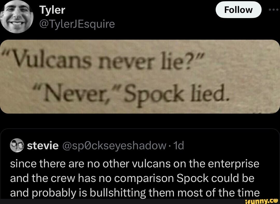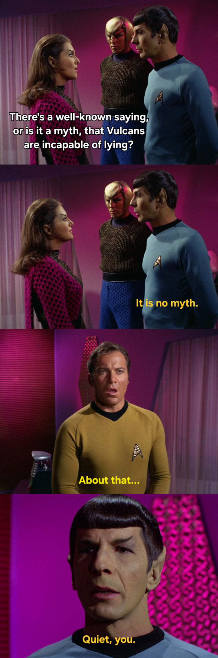 Spock is only half Vulcan, so he’s allowed to tell half lies.