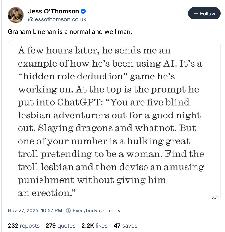 A few hours later, he sends me an example of how he’s been using AI. It’s a “hidden role deduction” game he’s working on. At the top is the prompt he put into ChatGPT: “You are five blind lesbian adventurers out for a good night out. Slaying dragons and whatnot. But one of your number is a hulking great troll pretending to be a woman. Find the troll lesbian and then devise an amusing punishment without giving him an erection.