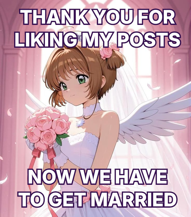 Description: A picture of an anime girl in a wedding dress (Card Captor Sakura). A caption above says “Thank you for liking my posts”. A second caption at the bottom says “Now we have to get married”