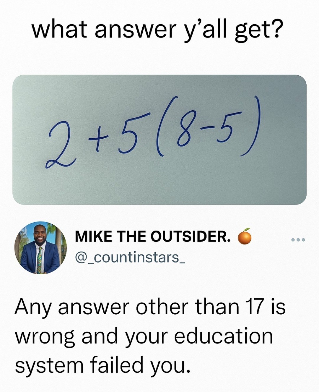 Some people insist there’s no “correct” order for the basic arithmetic operations. And worse, some people insist the correct order is parenthesis first, then left to right.