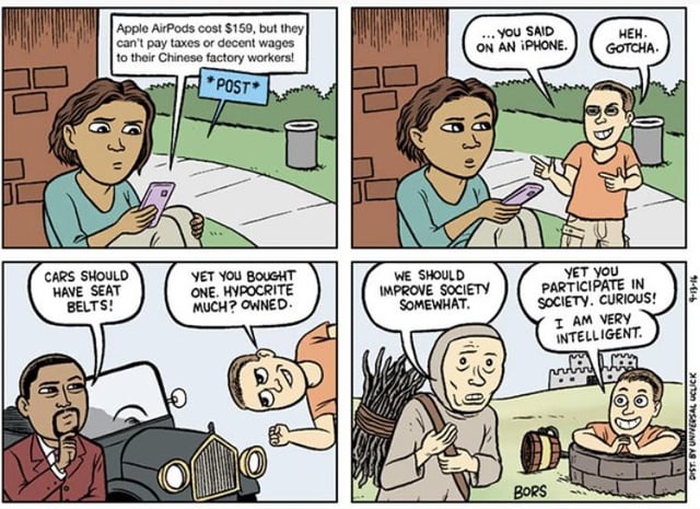 Edit: thinking about it, isn’t the first panel (of the original comic) the very definition of, “act on your principles when you have ample ability to do so”? I’m overthinking it, aren’t I? You were just trying to be snarky back at them… sorry, carry on then
