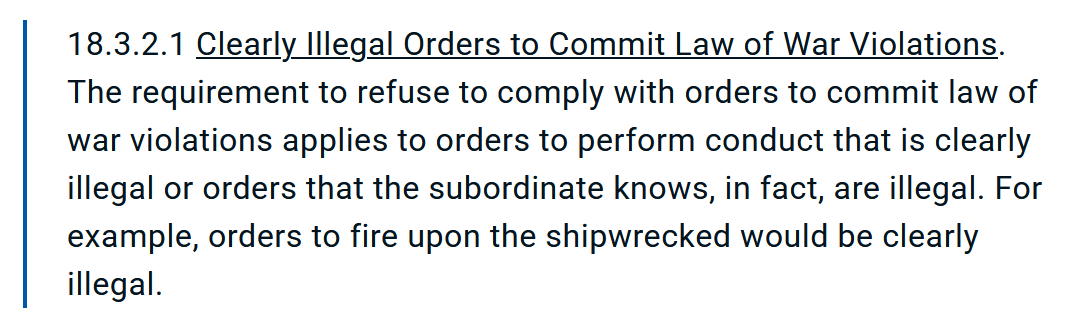 I won’t claim to have researched it myself, but I’ve seen about a dozen different people quote the section of military law that talks about illegal orders that are so blatant you don’t need to check or think, they’re illegal, and the example they use is “firing upon the shipwrecked”.