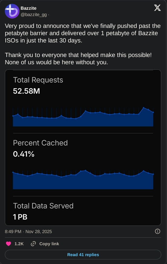 Should be manageable and it is probably less than you would imagine. Just checked real quick: the isos load from download.bazzite.gg, which is a Cloudflare IP. So they are either using it as CDN or even more likely use Cloudflares R2 storage for isos - which would mean they pay for storage (~15$/TB) and operations, but not for egress. This is seems ideal for few but huge files.