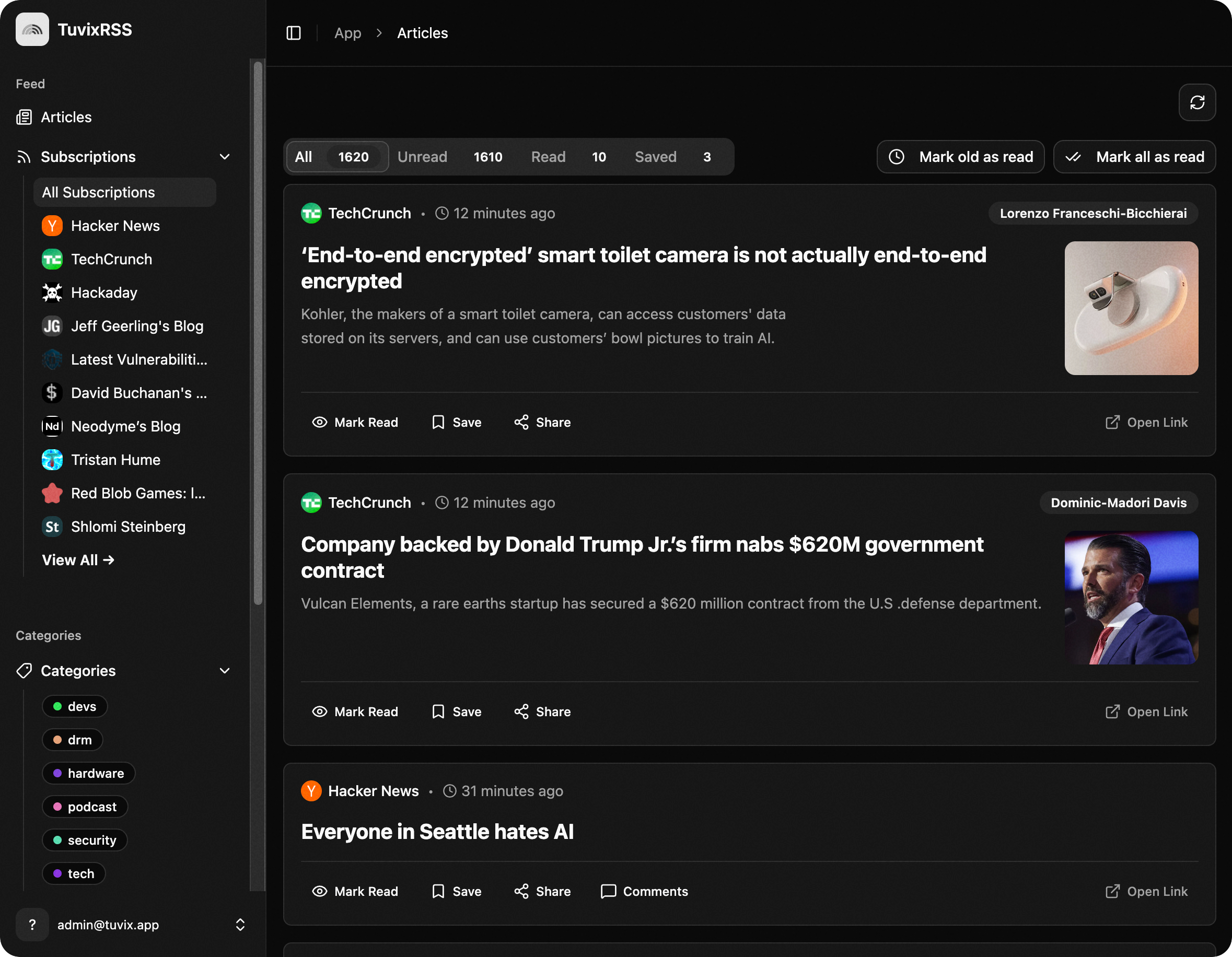 Same concept, different implementation. FreshRSS is a PHP app, in my opinion… a little ugly, still super functional of course. I wanted to try to create something with a more modern UX, and try to appeal to not just the tech folks. FreshRSS still supports things I don’t yet, like WebSub, but give me some time to catch up. I have the massive benefit of just starting much later when many awesome libraries and AI exist.
