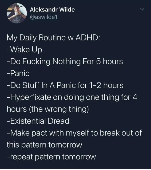 There’s always one of you people who has to chime in like this. Yes, neurotypicals can be like this. But for a person with ADHD it’s not a choice, it’s far more intense, and it’s debilitating when you’re aware of it and can’t force yourself to do otherwise.
