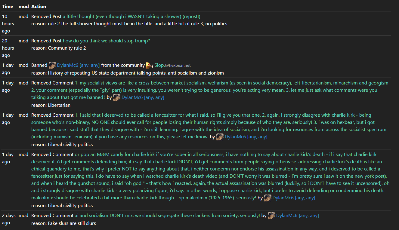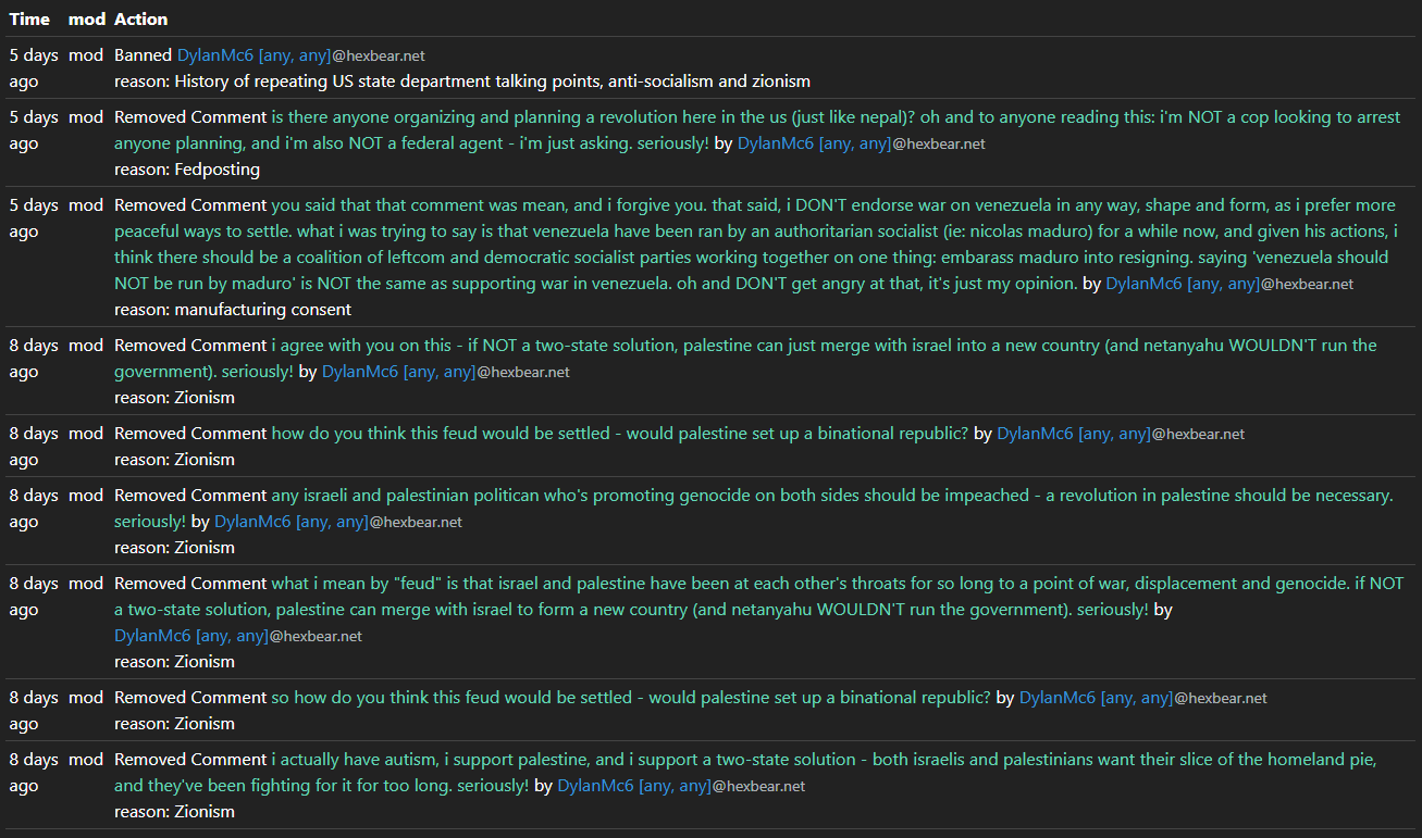 edit: here are the modlogs (for this account and !DylanMc6@hexbear.net):