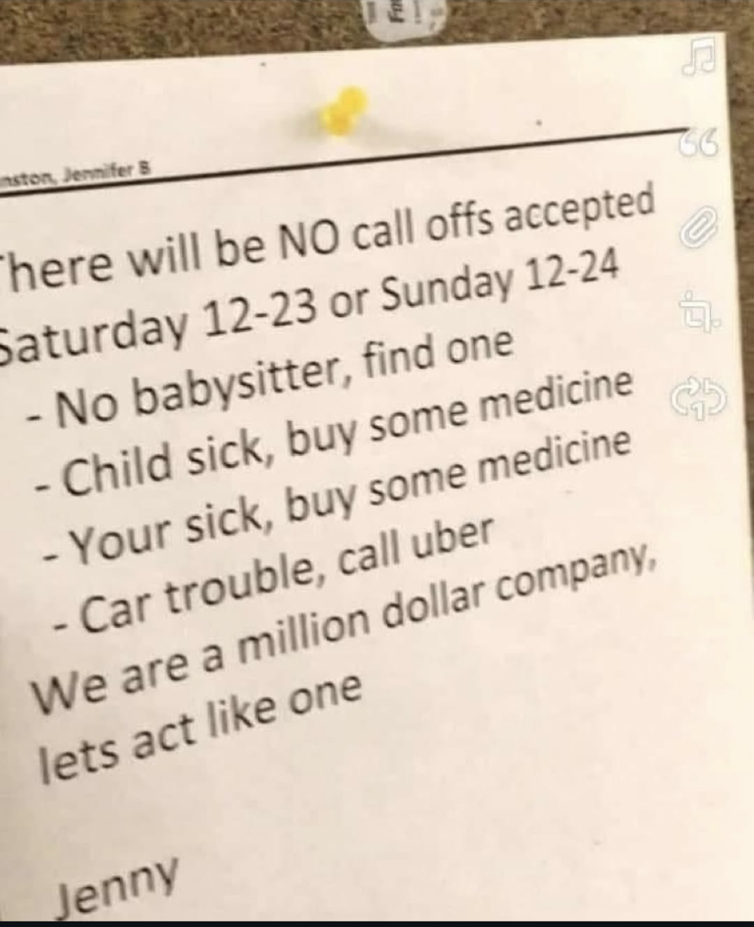 Never mind that surely a big company doesn’t explode the second someone calls in sick. The whole sign makes no sense at all.