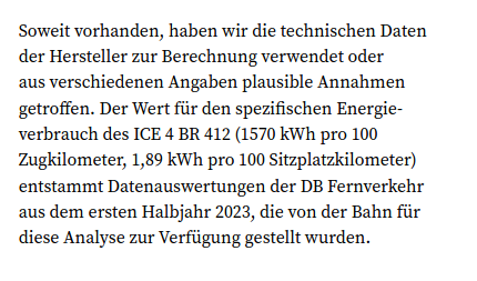Hast du ne Quelle zu den 1,9 kWh pro 100 Sitzplatzkilometer? Fänds interessant, ob das mit der durchschnittlichen ICE-Auslastung berechnet wurde oder mit der Gesamtsitzplatzanzahl.
