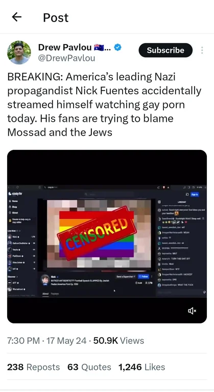 arrow-up16arrow-down1imageNazi Propagandist Nick Fuentes Caught on Stream Watching Gay PornFive@slrpnk.net to United States | News & Politics@midwest.socialEnglish · edit-22 years agomessage-square8linkfedilinkfile-text