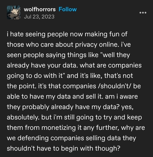 For anyone looking for great talking points about this issue, I highly recommend “Taking Control of Your Personal Data” by prof. Jennifer Golbeck, published by The Teaching Company, ISBN:978-1629978390, likely available at your local library as a DVD or streaming.