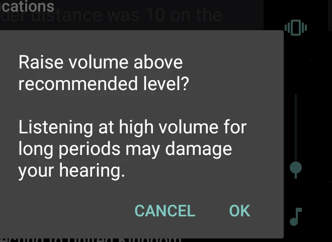 On my old-ass Samsung, you cannot turn down the volume while that message is shown. So when your phone is in a pocket and you increase the volume but don’t notice that the message appeared, you cannot save your ears when the next song actually is much louder.