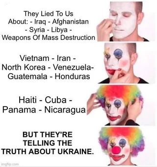 Smackyroon@lemmy.mlOPto Memes@lemmy.ml•Craycray what liberals will do with a simple change of flags1122·1 month agoSoz, but you’re just continuing to parrot empire propa, Russia had a very good cause to put an end to relentless US imperialism through NATO. Of course all the western media is going to exaggerate on everything to make them seem horrible to those who believe the propaganda