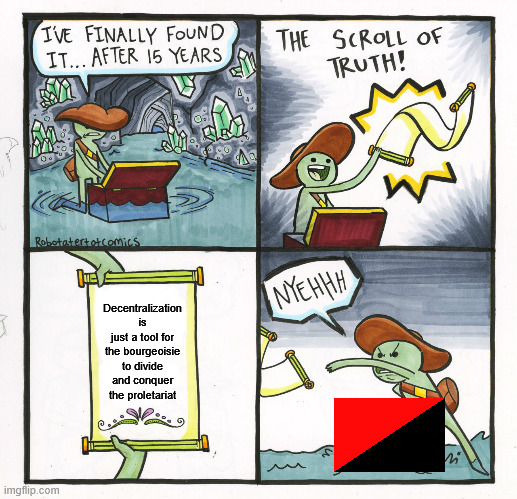 Decentralization? That’s just a fancy word for chaos and the bourgeoisie want that. Centralized power is the only path to true communism. Some of us understand that