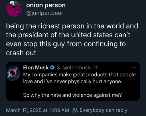 glepswizardhat@lemmy.world to Enough Musk Spam@lemmy.world · 8 months agoPlease don't stop hating guys it's workingplus-squarelemmy.worldimagemessage-square2linkfedilinkarrow-up17arrow-down10