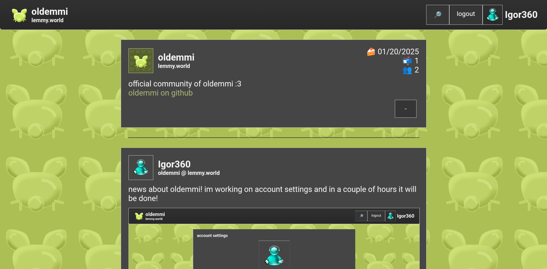 igor360@lemmy.world to Lemmy Apps@lemmy.world · edit-29 months agonews about oldemmi: IT WILL BE DONE SOON!🎉🎉🎉 (oldemmi is a lemmy client by me)plus-squareimagemessage-square0linkfedilinkarrow-up10arrow-down10
